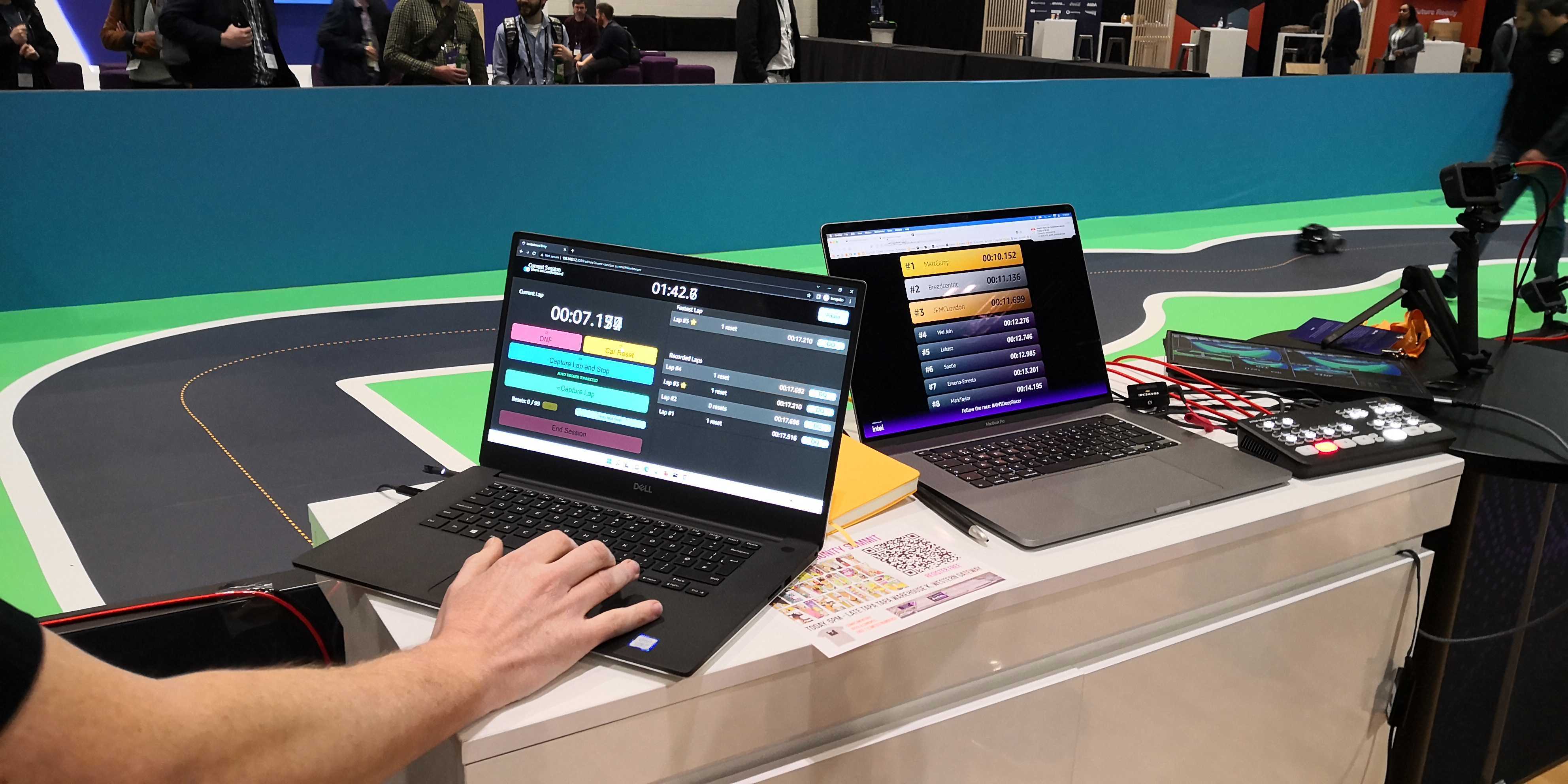 DBro took a break from his AWS Summit tour to join us for the finale and started strong at 26.592 seconds, followed by 26.065 seconds, then a little bit above 26.2 seconds, and a slower lap with a reset in fourth, again, followed by a clean 25.801 seconds and a narrowly slower sixth lap, giving him a lead at the time.