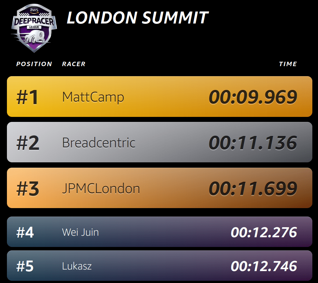 | ?th October 2022 | ? | AWS DeepRacer Enterprise Wildcard Finalist |
