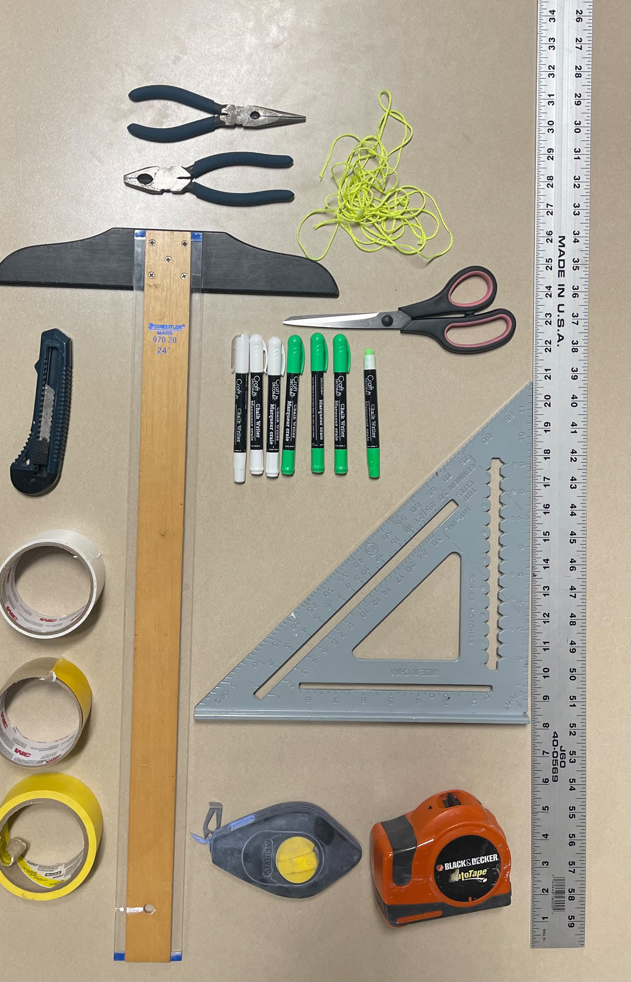 Below are the tools used on both the classroom and the mobile track. Not included are the rags and spray water bottle used when lines didn’t seem to quite make sense. With the Chalk Writer, we just erased and started again. A resounding round of applause 👏 for the creator of these fantastic pens. Pick them up at a dollar store for $1.25 🤔.
