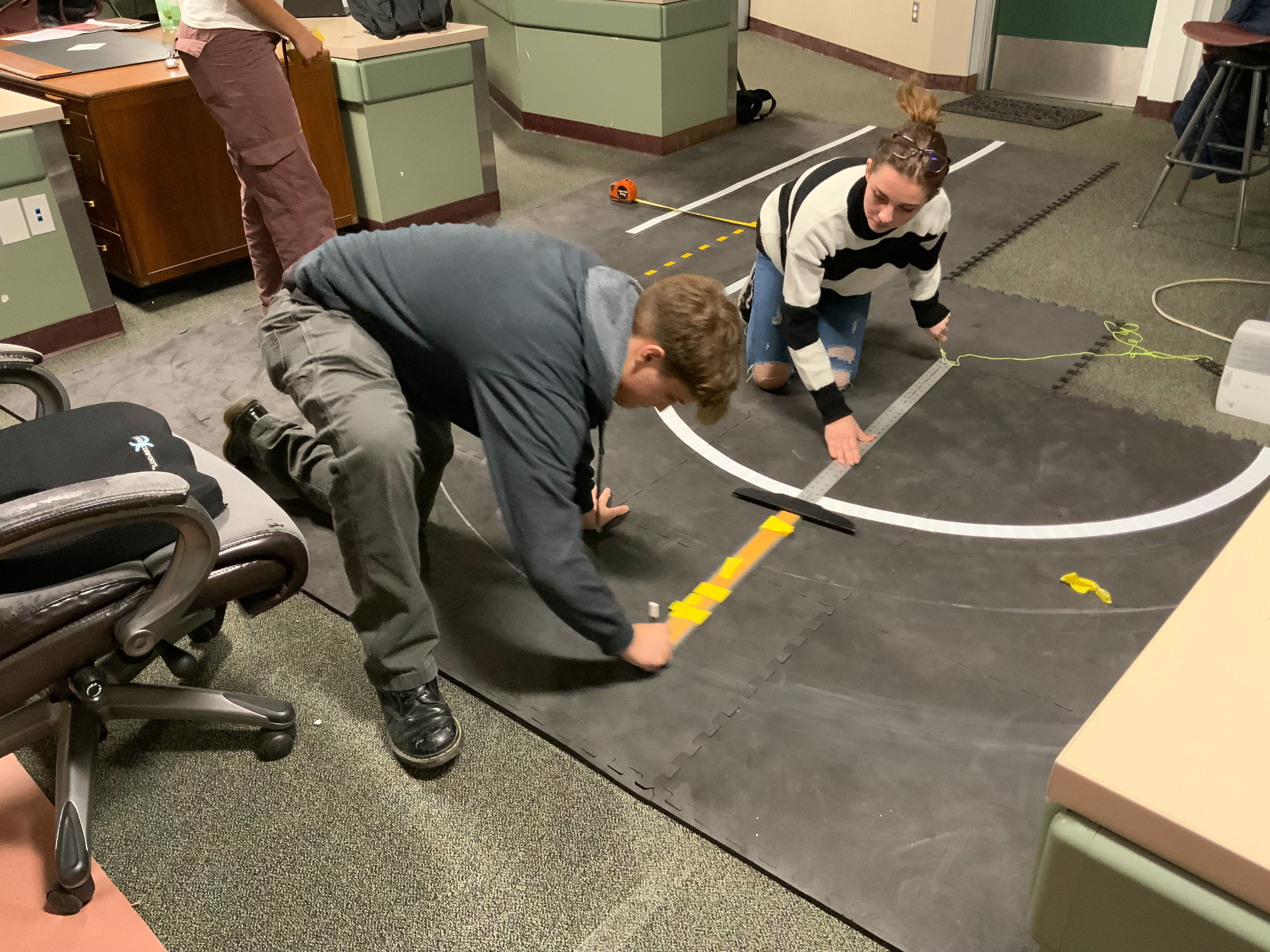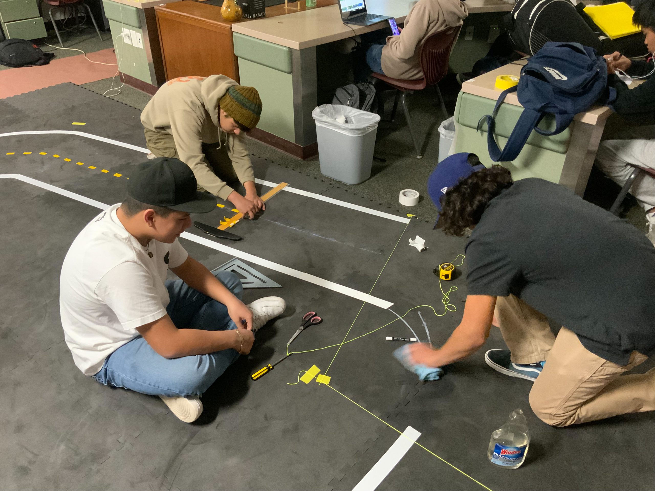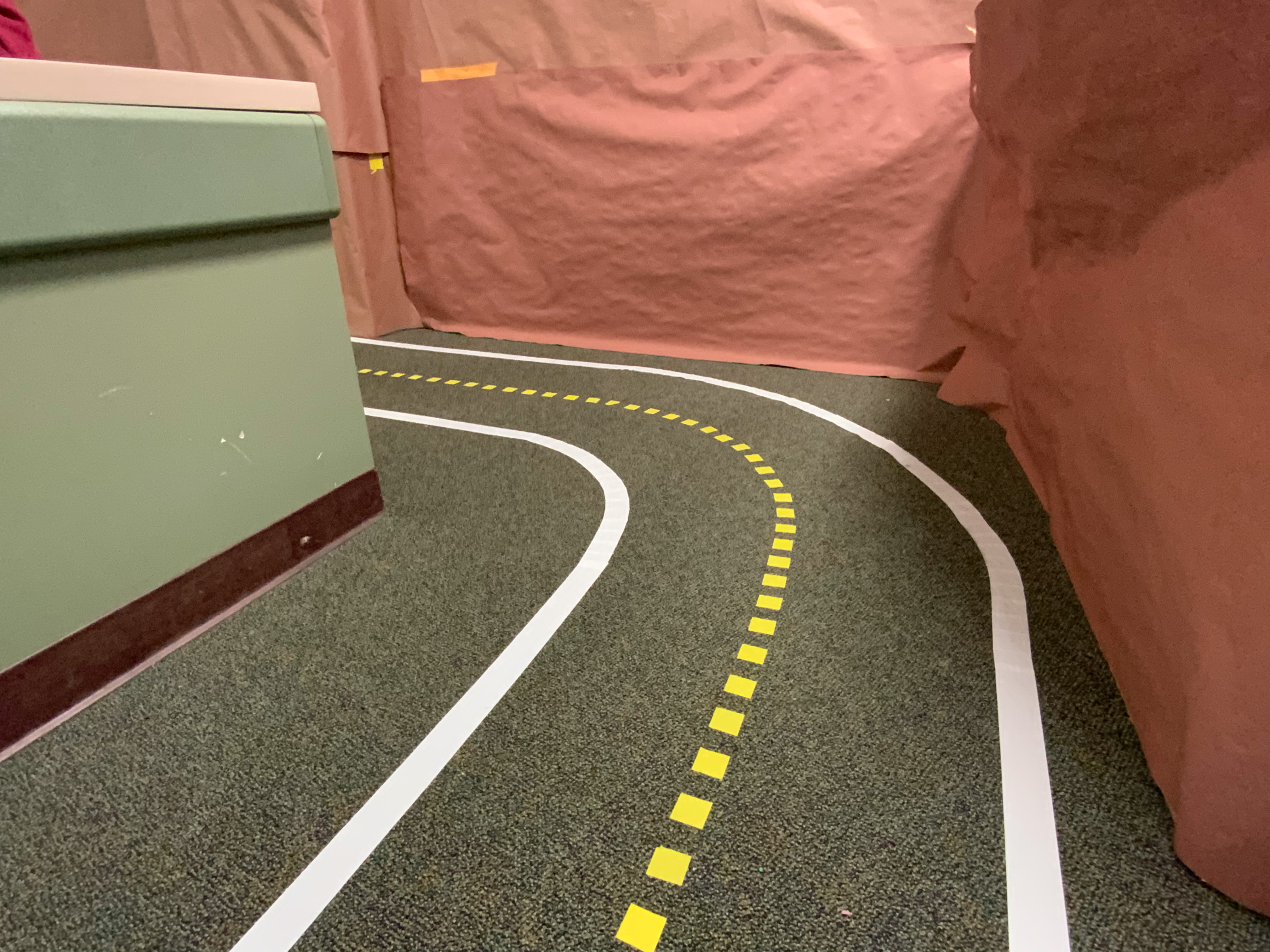 For both tracks, we used 2” white duct tape for the white lines and 2” yellow duct tape cut into 1” wide strips for the center line. For the classroom track we used 1” yellow masking tape cut into 1” strips for the center line. We only used masking tape because it worked well with the carpet, it was only later that we discovered that duct tape was a stronger option. Pictured below are the items we used in the build with prices and lengths listed. This should give you a good basis to go off of for estimating the cost of your project.
