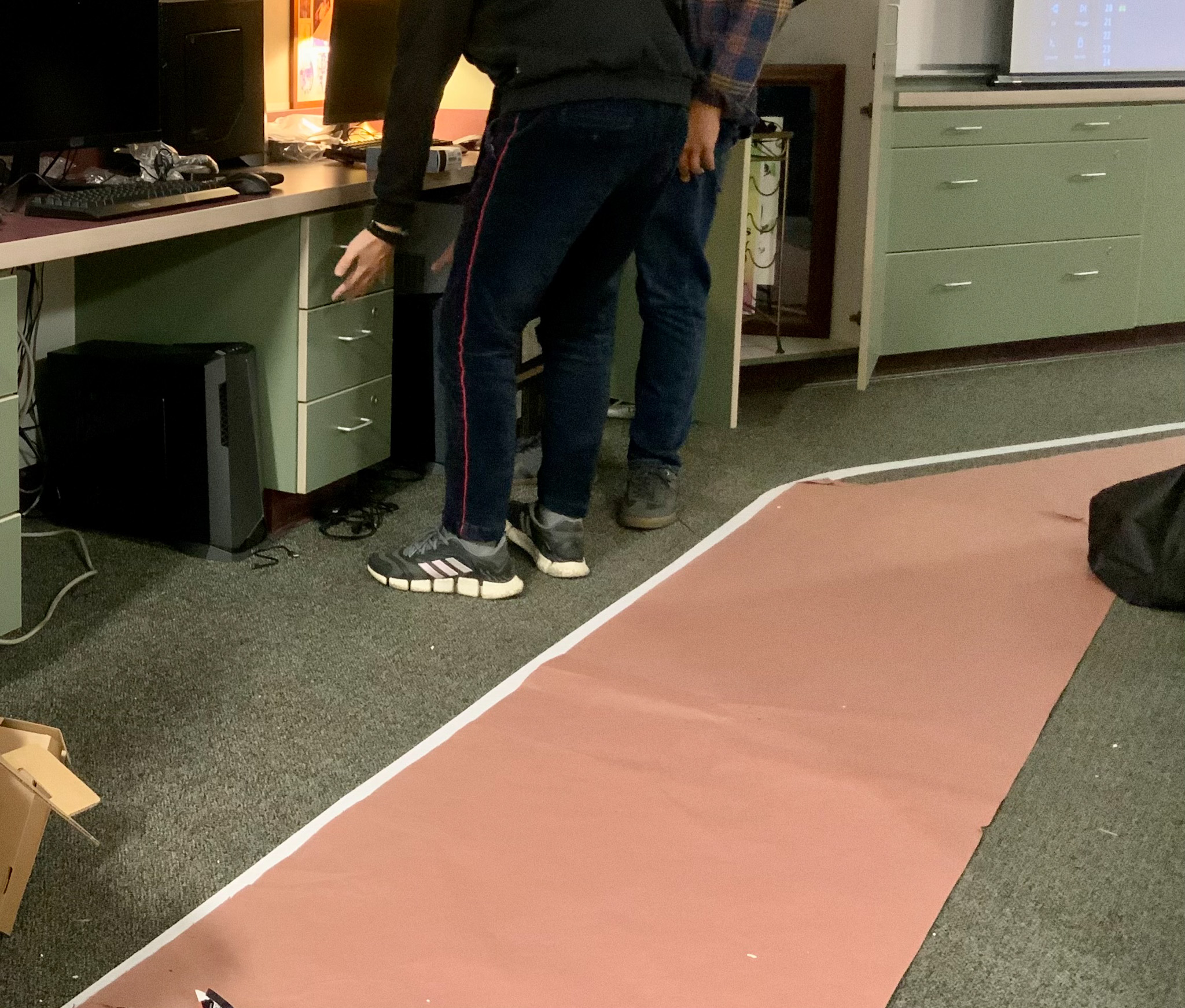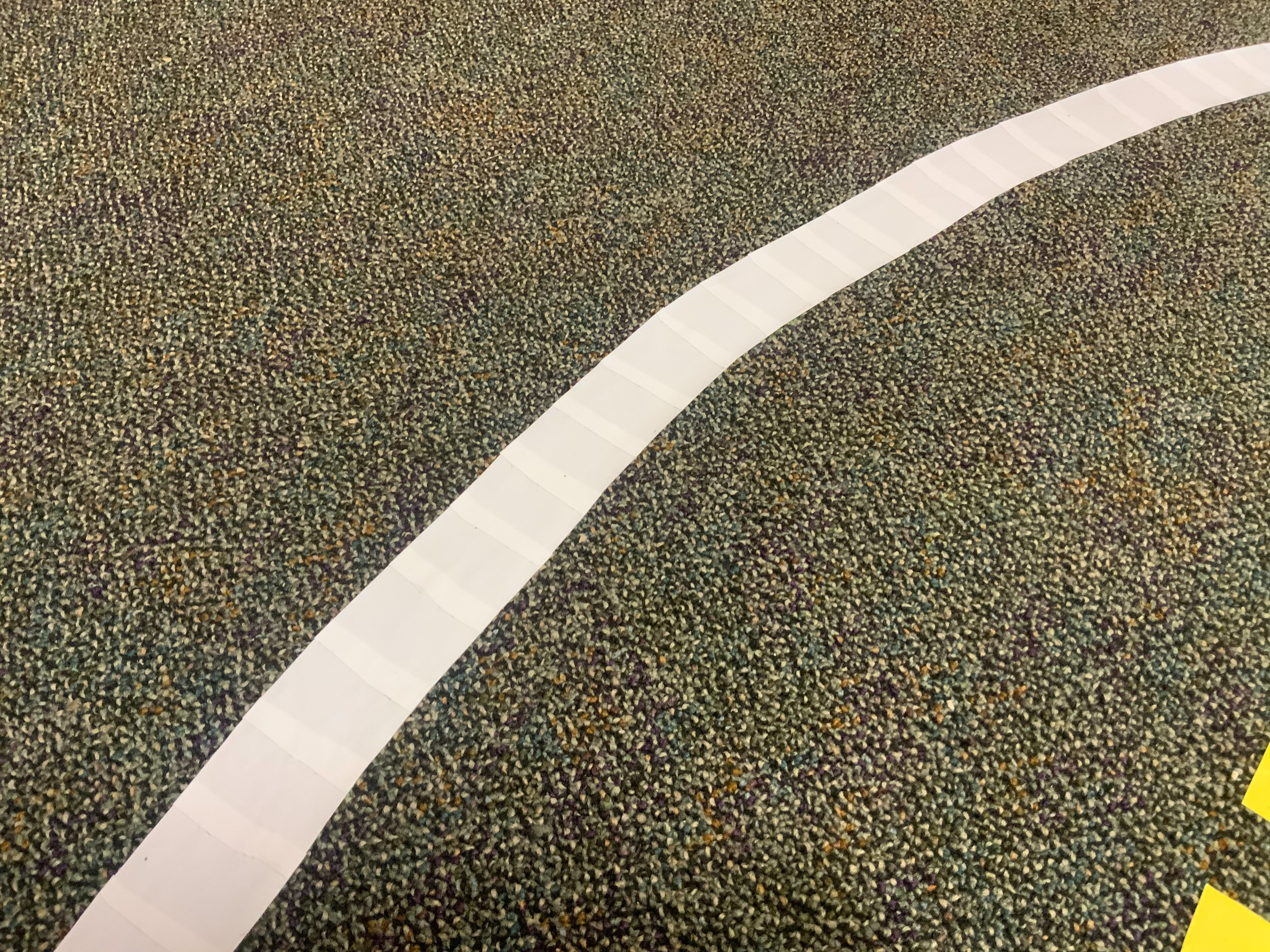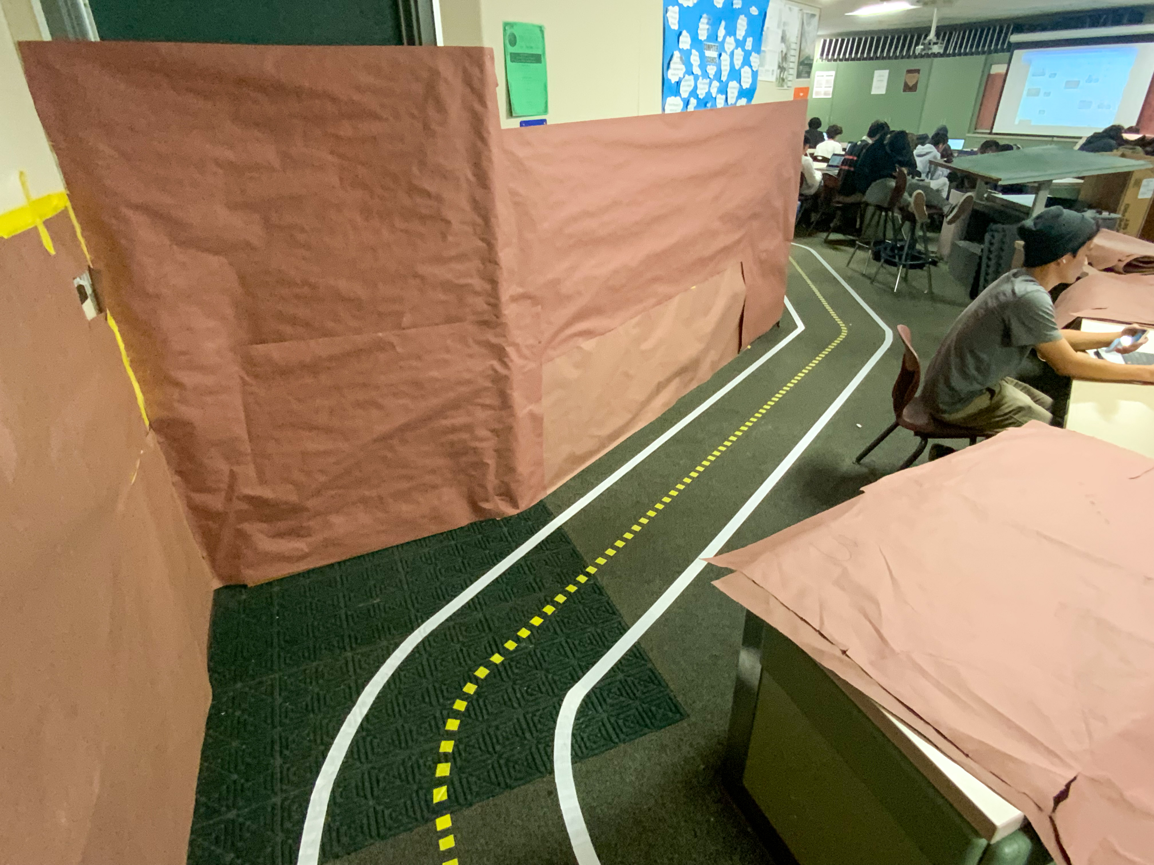 If you are building a classroom track, it is beneficial to start thinking about how to protect the track from foot traffic from your students. I used rose-colored construction paper at first but it was difficult to have the entire track covered and the foot traffic soon turned the paper into what my students deemed as “salad.” I was then able to get some “Ram Board” donated. Three things came from laying down Ram Board (Sometimes referred to as X Board):