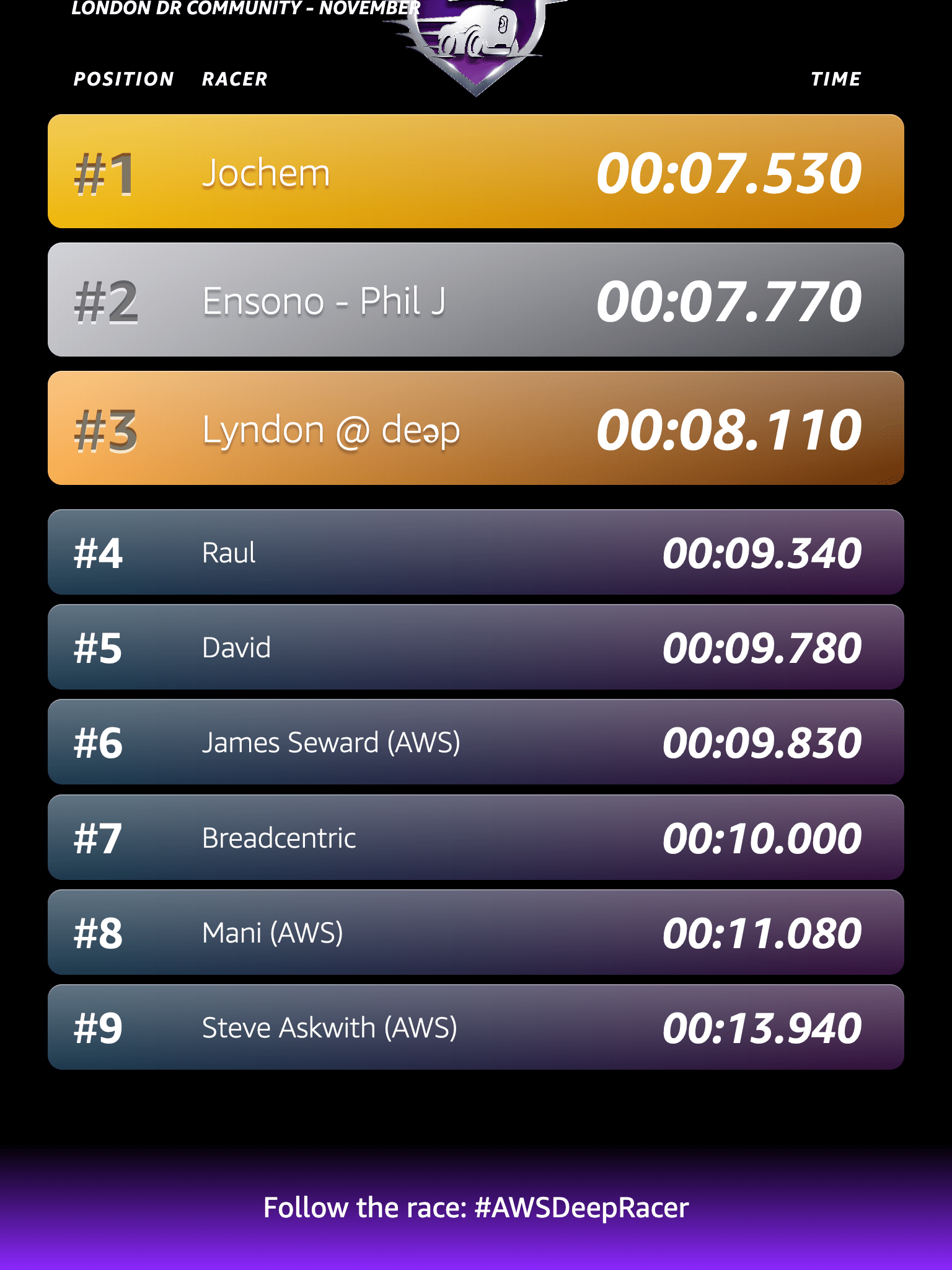 If you want to know about upcoming events in London, be sure to join the AWS DeepRacer Community and visit channel #meetup-uk-london. If you want to organise your own event and would like help getting started, visit channel #meetup-organisation. We’re always happy to help.